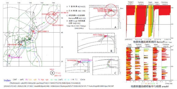 2026年2月までの日本全域2年間のCMT解は396個で(図648),その総地震断層面積規模ΣM8.9のPlate運動面積規模M8.2に対する面積比は5.392倍と大幅に超過している(図648の中図上).日本全域と千島海溝域のBenioff曲線(図648右図上左端Total/4と右端Chishima[A])は2025年7月30日の最大地震M8.8(月刊地震予報191)の巨大な段差に隠され他の段差は見え難いが,琉球南海域(図648右図上左端の右側のRykNnk[D])には,下端の2024年4月3日の台湾海溝震源帯M7.4(月刊地震予報176),2024年8月8日九州小円区深度36㎞の日向灘M7.0(月刊地震予報180)の2つの段が認められ,それ以降静穏化していたが,2025年1月13日日向灘M6.7(月刊地震予報185)の3つ目の段が認められる.千島海溝域は,2025年に入り完全無CMTを保ってきたが(図648右下地震断層面積移動平均規模areaM図右端A),5月31日に5月最大地震M6.1が起こり(月刊地震予報189),6月22日にも6月最大地震M6.0が続き半年ぶりに活動期入していた(月刊地震予報190).琉球南海域[D]では6月22日に悪石島連発地震が開始され(月刊地震予報190),千島海溝域で7月30日のM8.8最大地震(月刊地震予報191)に続き9月19日M7.8が起こったが歪軸方位に変化がなく(月刊地震予報193),千島海溝域の歪の完全解放に至っていない.静穏化の続いていた日本海溝域[B]では2025年12月8日の最大地震東北前弧沖下北震源区ofAcJSmkM7.4psに続きその東方の深度の浅い東北弧沖襟裳南震源区oAcJEsで12月9日M6.0Ps・M6.5Ps・12月12日M6.8psと東北弧沖久慈震源区oAcJKjM12月31日M6.0Psが起こっていたが(月刊地震予報196),2026年に入り千島海溝域の択捉沖で1月最大地震が起こり,巨大地震の予想される得撫に近付いている.
