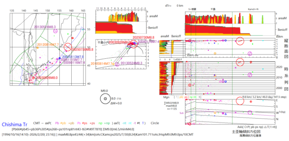 千島海溝域は,千島和達δ得撫震源区WdtiDCUrの2012年8月14日M7.7pb深度610㎞・千島和達δKamchatka震源区WdtiDCKamcの2013年5月24日M8.3深度632㎞以降,長期静穏期にあったが,2025年初からCMT解の無い数か月の完全静穏期を経て活性化し,千島弧沖Kamchatka震源区oAcCKamcの2025年7月30日Kamchatka地震M8.8psを起こし(月刊地震予報191), 2025年12月8日東北前弧沖下北震源区ofAcJSmkM7.4ps・東北弧沖襟裳南震源区oAcJEsの2月9日M6.0Ps・12月12日M6.5Ps・12月28日M6.8psと東北弧沖久慈震源区oAcJKjの12月31日M6.0Ps(月刊地震予報196)・千島弧沖択捉震源区oAcCEtrの2026年1月13日M6.2Ps(月刊地震予報197)を誘発した.これらの地震は,何れも海洋側に凹の海溝軸輪郭の千島海溝北・南端に位置し,余剰Slabの襞と島弧地殻・Mantleとの接触面に沿う剪断逆断層型ps型である(図849右下歪軸傾斜方位図上端の赤丸).
