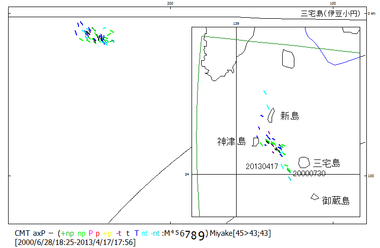 図92. 2013年4月17日三宅島地震.  2013年4月17日の2個の地震と2000年の三宅島噴火に伴う地震の主応力軸方位。2000年7月30日に震源域が突然南方に移動し、噴火の様相が一変した。